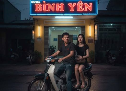 Xe rẽ khỏi con phố nhỏ, nhập vào đường lớn. Bên phải là một dãy nhà nghỉ cũ, bảng hiệu mờ đèn, chữ “NHÀ NGHỈ BÌNH YÊN” lấp ló như một câu đùa nhạt. Chúng tôi lướt ngang. Đột nhiên, anh giảm ga, tấp vào lề, quay qua, giọng vừa nhẹ vừa dứt: “Vào đây đợi anh một chút.”