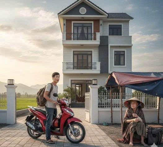 Chỉ là… tôi không ngờ, thứ đầu tiên đập vào mắt lại là một căn nhà ba tầng mới tinh, tường quét sơn vàng nhạt, lan can kính sáng choang, trước sân còn dựng một chiếc SH đỏ chói.