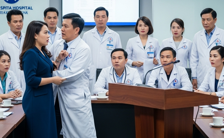 Giám đốc cùng vài bác sĩ khác đang họp, thấy cô đến, tưởng có việc gấp.