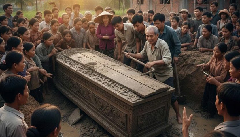 Lời vừa dứt, xung quanh đã râm ran tiếng bàn tán. Đất được bới thêm, bùn nhão tràn ra hai bên, và rồi… một góc cạnh bằng gỗ sẫm màu lộ ra.